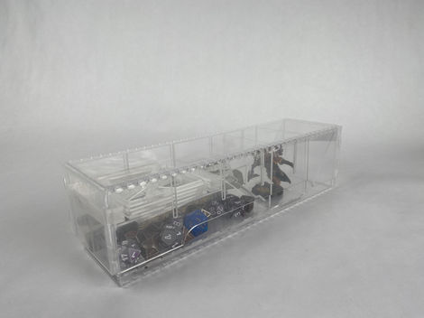 Created as part of the acrylic heat bending project for Intro to Product Design. The assignment was to design a container made with flat, laser cut acrylic sheets and heat bending. I chose to create a collapsible dice tower that serves as a Dungeons and Dragons player kit, able to hold dice, stationary, and one miniature model.